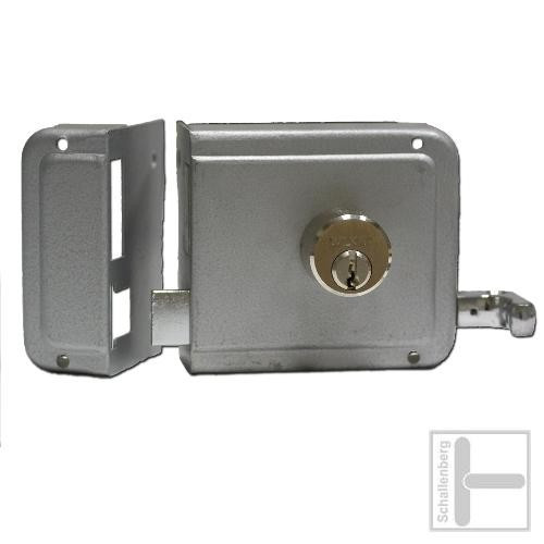 Schweres Zusatz-Kastenschloss mit Ziehknopf und Außenzylinder.